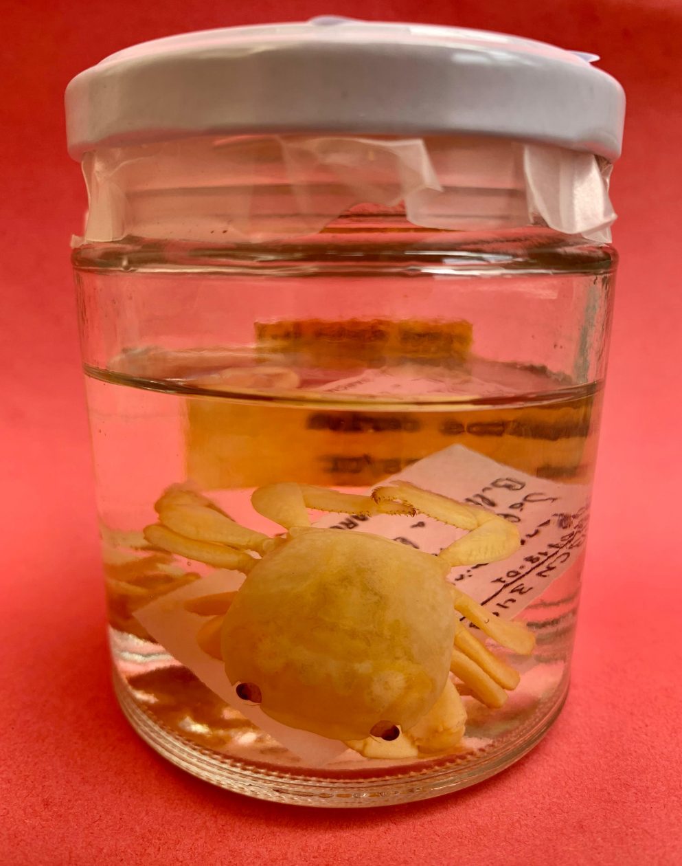 El nom comú de l’espècie prové del fet que aquests crancs se solen trobar entre les cames posteriors de certes espècies de tortuga marina, especialment la tortuga babaua (Caretta caretta). Un temps es pensava que era perquè s’alimentava de la seva matèria fecal; ara, però, se sap que el cranc compleix una funció de neteja de la closca de la tortuga. Els dos exemplars que conformen la peça d’aquest mes, de gran mida, foren capturats l’any 1986 a prop del port de Sóller, viatjant en un objecte a la deriva.