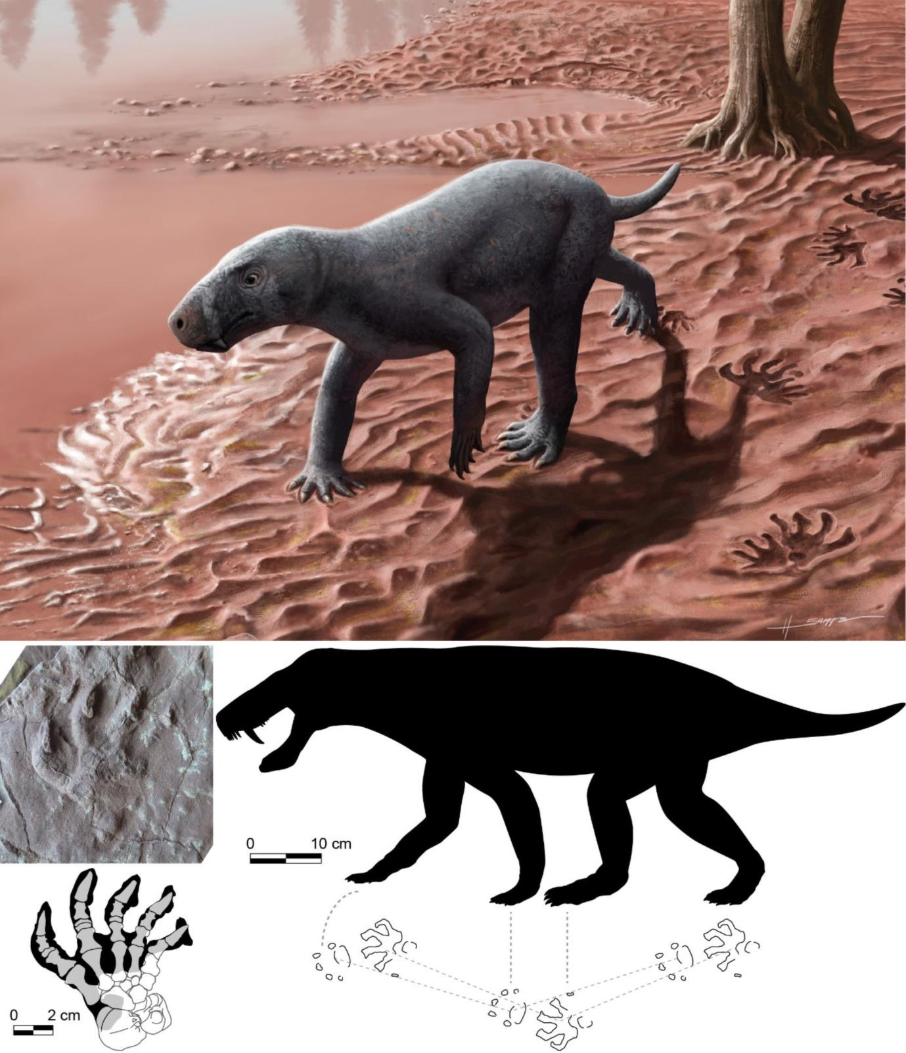 A dalt, reconstrucció del gorgonopsi caminant al seu hàbitat (autor: Henry Sutherland Sharpe©). A baix, impressió d’un peu comparada amb la reconstrucció dels ossos basat en el gorgonopsi de Mallorca (esquerra), i silueta de gorgonopsi caminant basada en els rastres preservats (dreta).